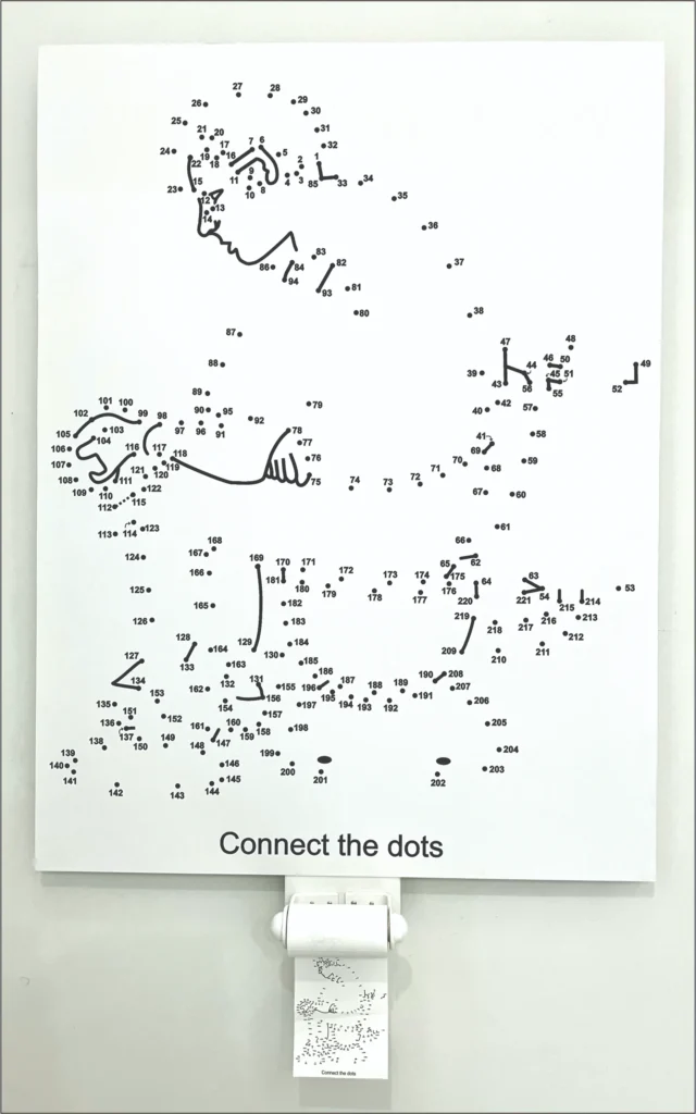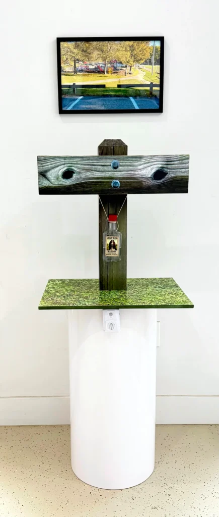 Modern abstract sculpture with geometric shapes and a small figurine.