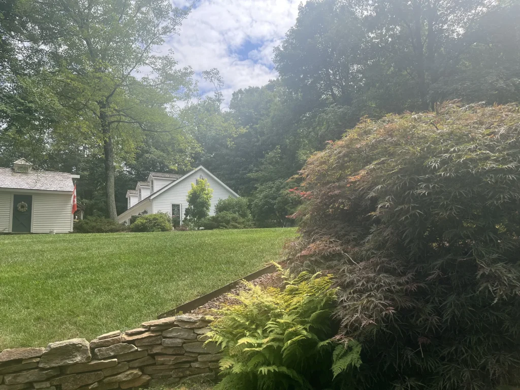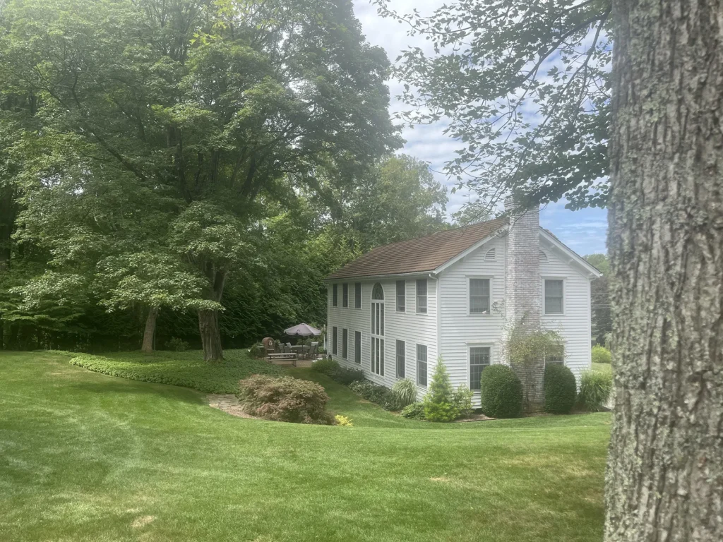 A charming white house surrounded by lush greenery and flowers under a blue sky.