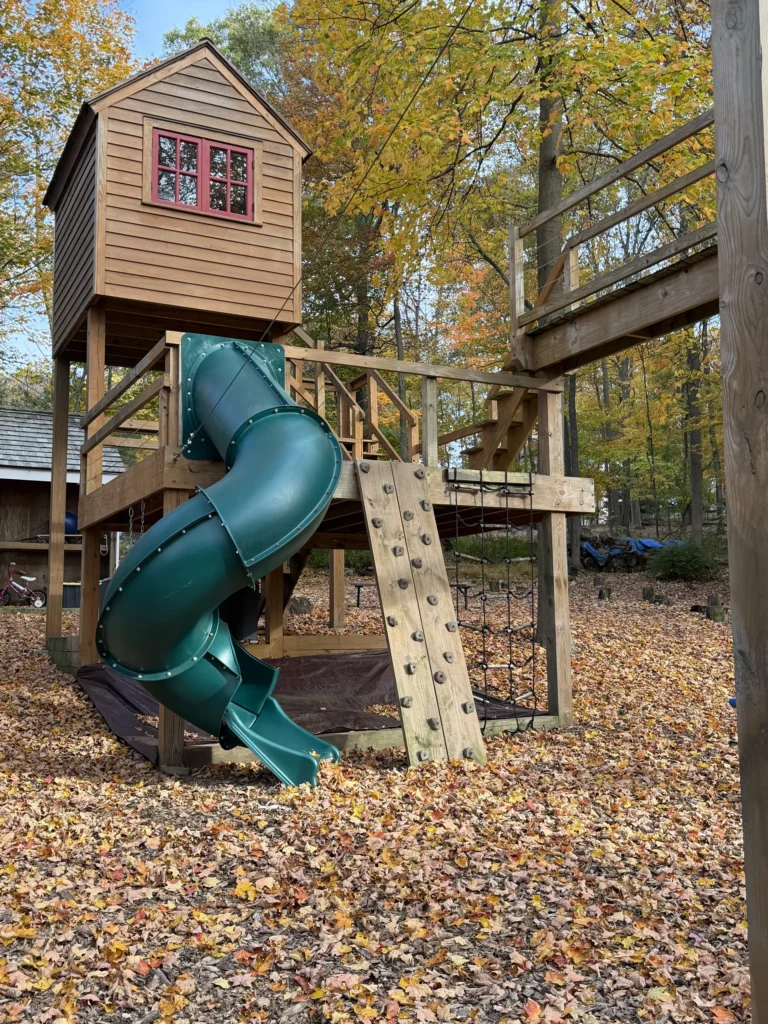 Wooden treehouse elevated with stairs and railing among autumn trees.