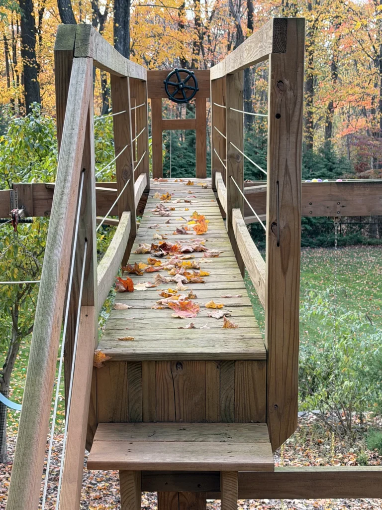 Wooden footbridge with autumn leaves scattered on it during fall.