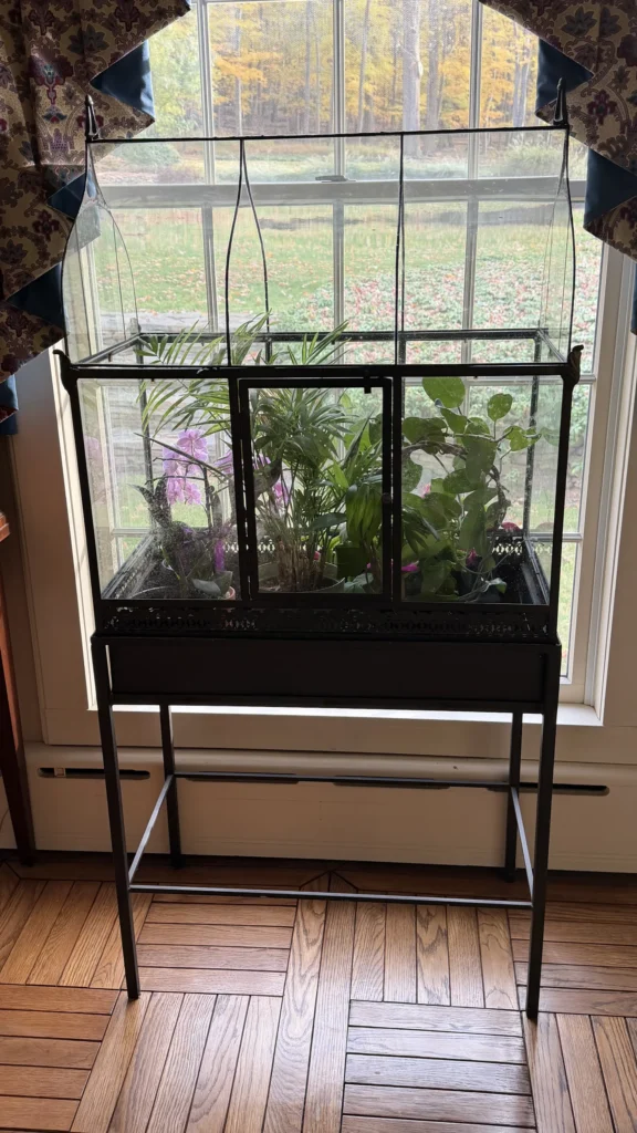 A tall white birdhouse on a pole in a grassy yard with autumn trees.