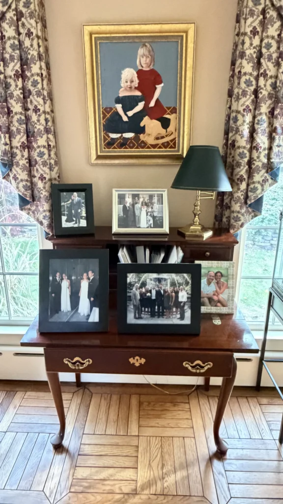A wooden table with framed black-and-white photos and a lamp near a window.