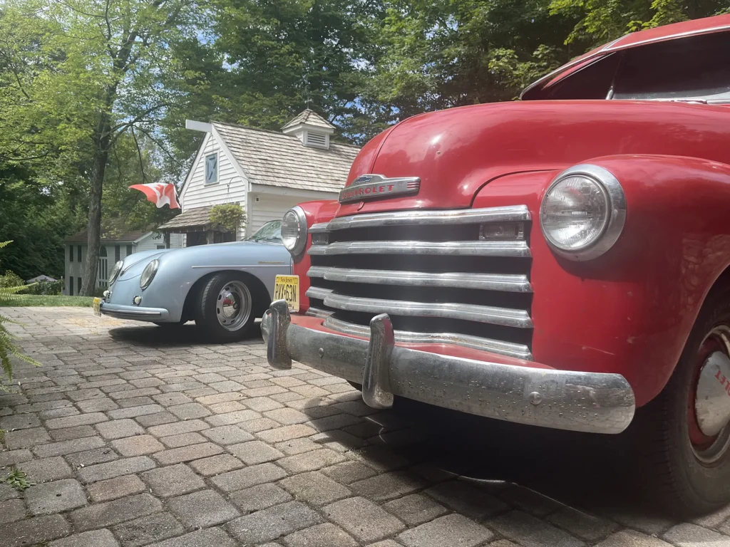 Two vintage cars parked on a cobblestone driveway surrounded by greenery.