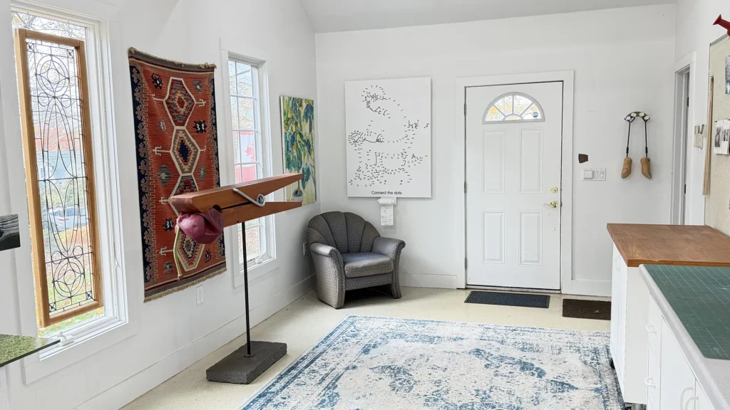 Cozy reading nook with armchair, rug, and decorative wall art near a front door.
